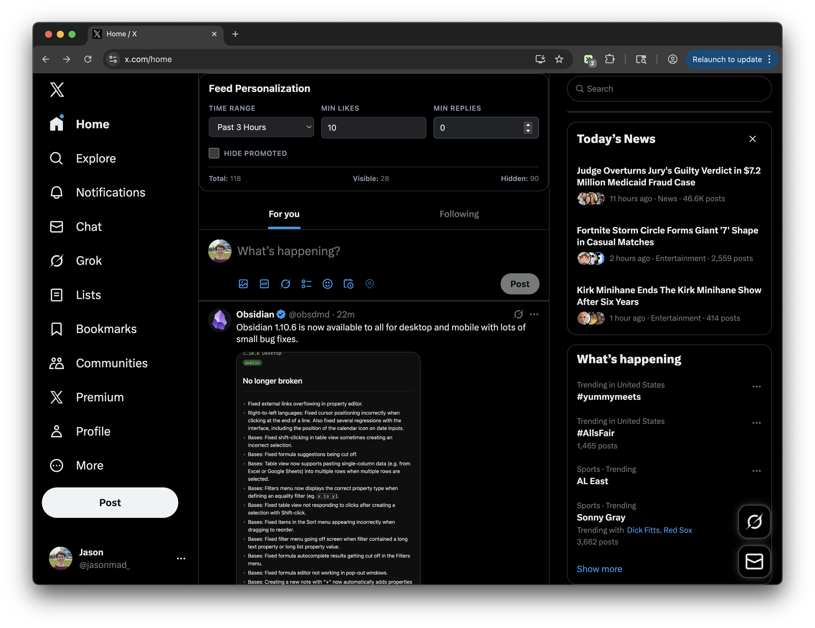 Add a Feed Personalization panel to filter posts by time, hide ads, and filter by engagement metrics - works on both main feed and individual posts!