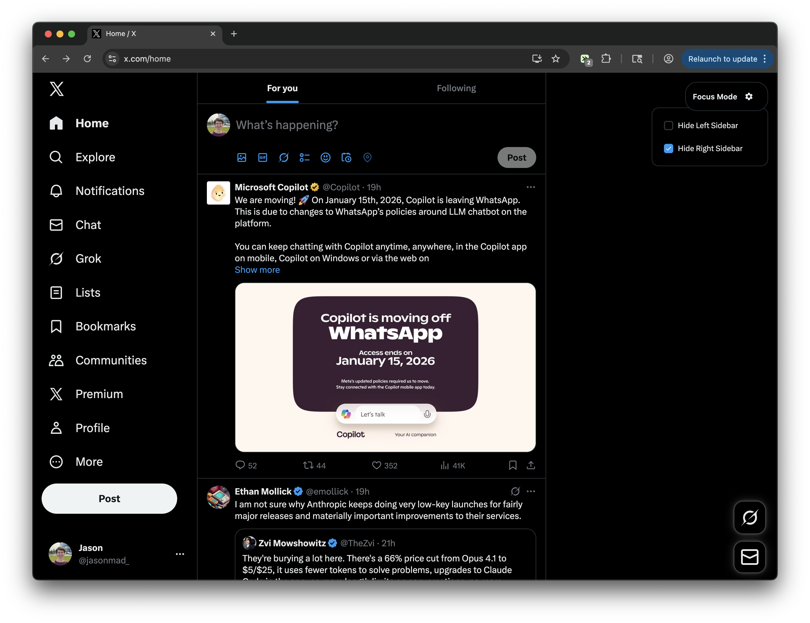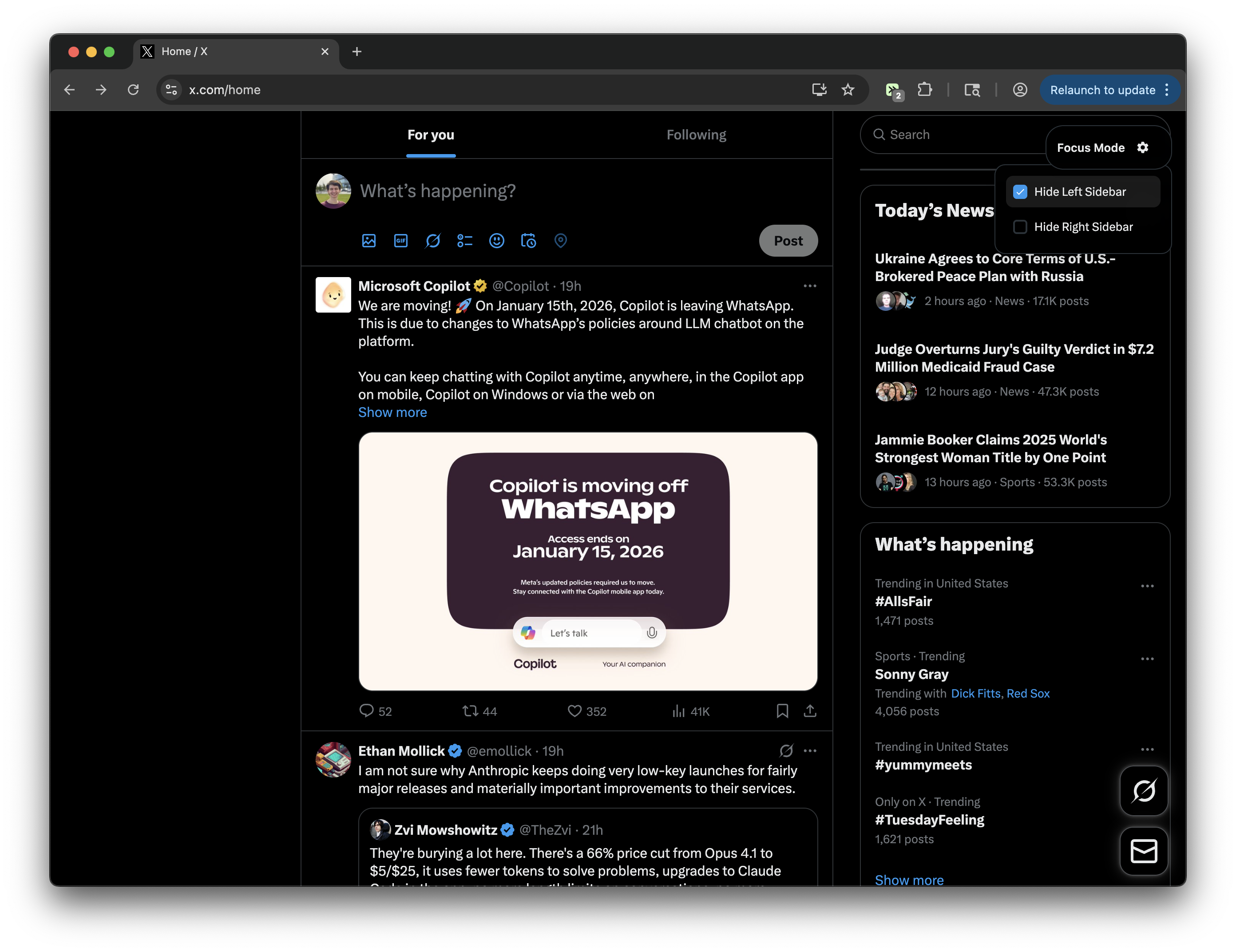Toggle left and right sidebars for a distraction-free experience on X.com.