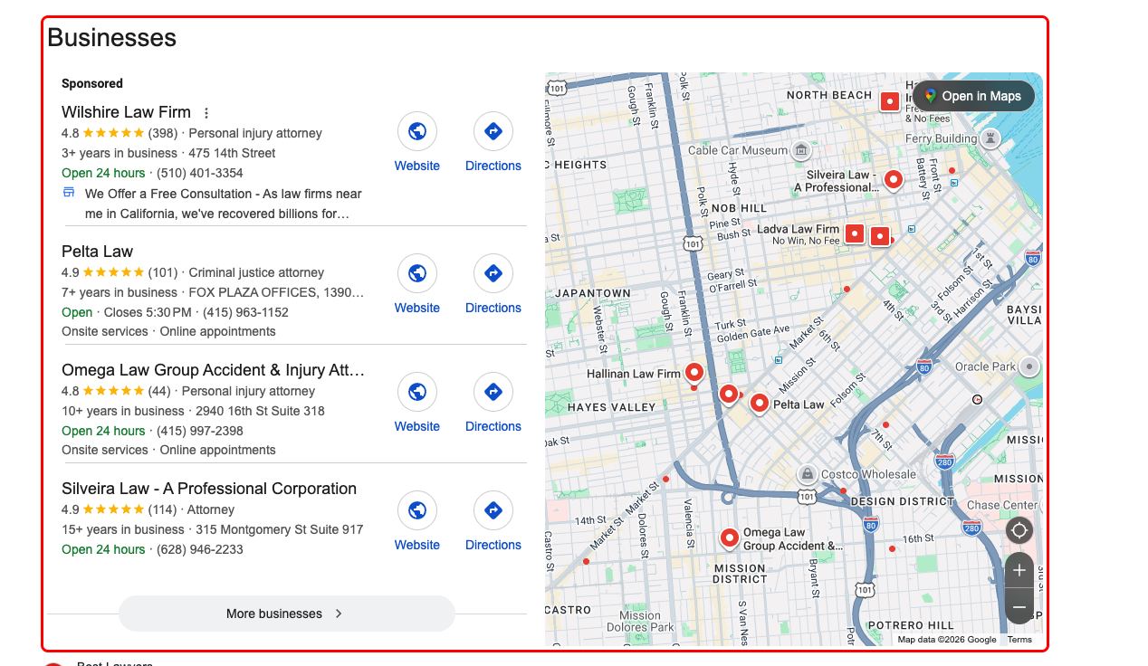 Highlights the business section with a red border on Google search results