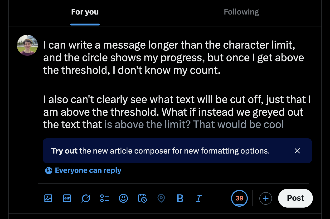 Fades text past X's soft limit (280 chars) and shows an over-limit ring counter using X-style weighted counting. Works across all composers (main post, reply, etc.)