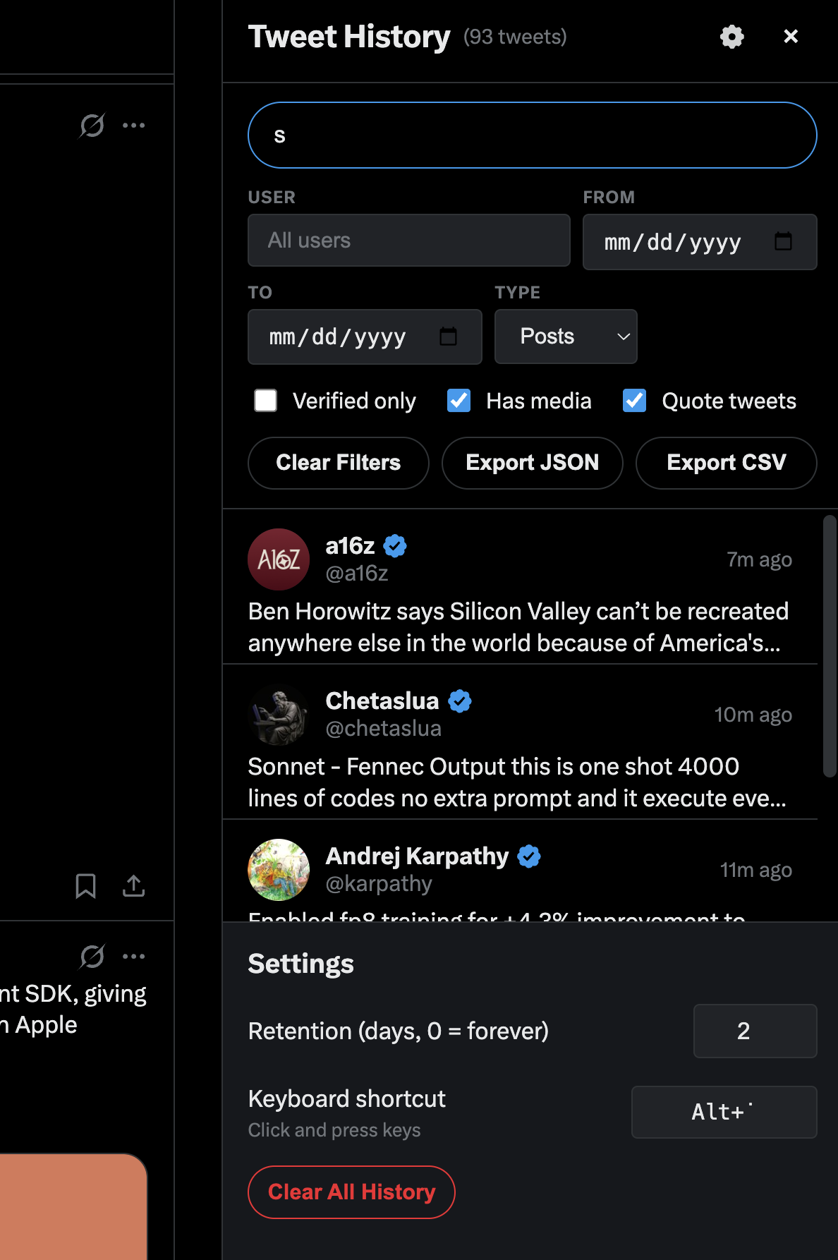 Automatically logs every tweet you view on X/Twitter to a local database (no servers/accounts/tracking) so you can find that tweet you saw yesterday and forgot to save. Open viewer with the left menu bar or a custom keyboard shortcut. FEATURES: - Searchable sidebar UI with text search across tweet content and usernames - Filter by: user, date range, verified accounts, media, quotes, posts vs replies - Configurable data retention (default 30 days) - Set custom keyboard shortcut to toggle sidebar