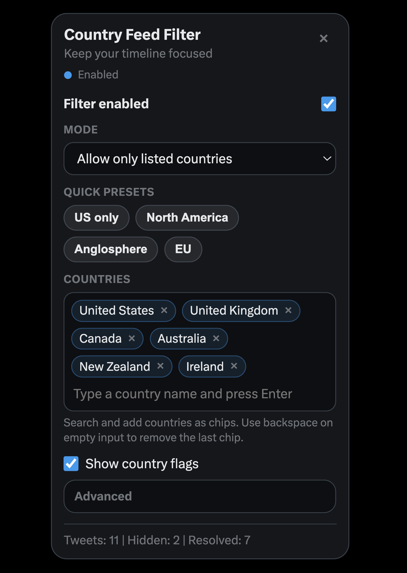 Adds country flags to posts and lets you filter your X feed by country, either showing only selected countries or hiding specific ones.